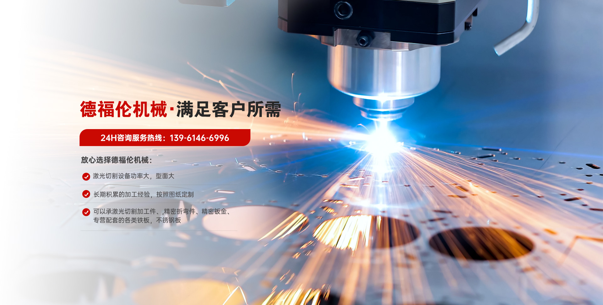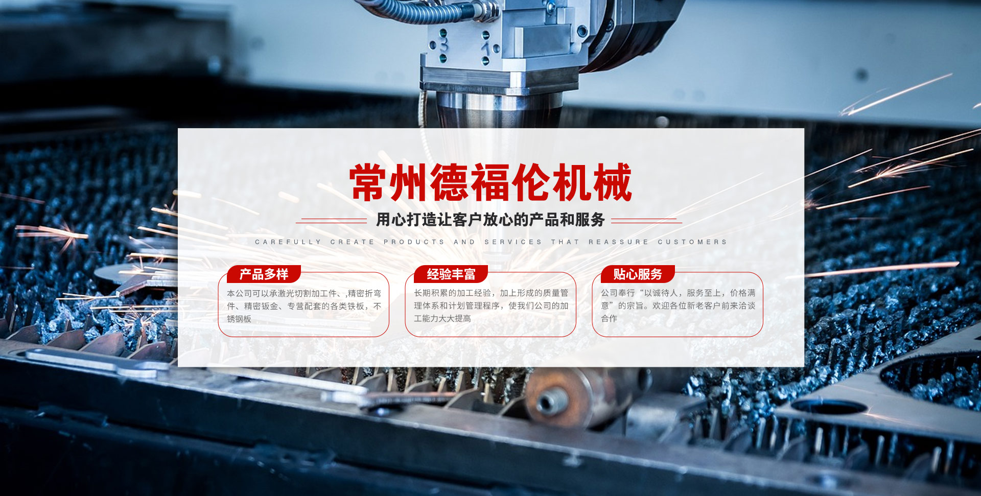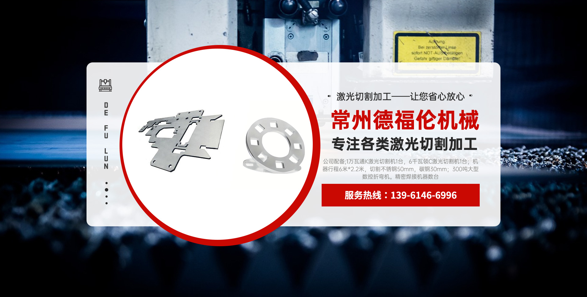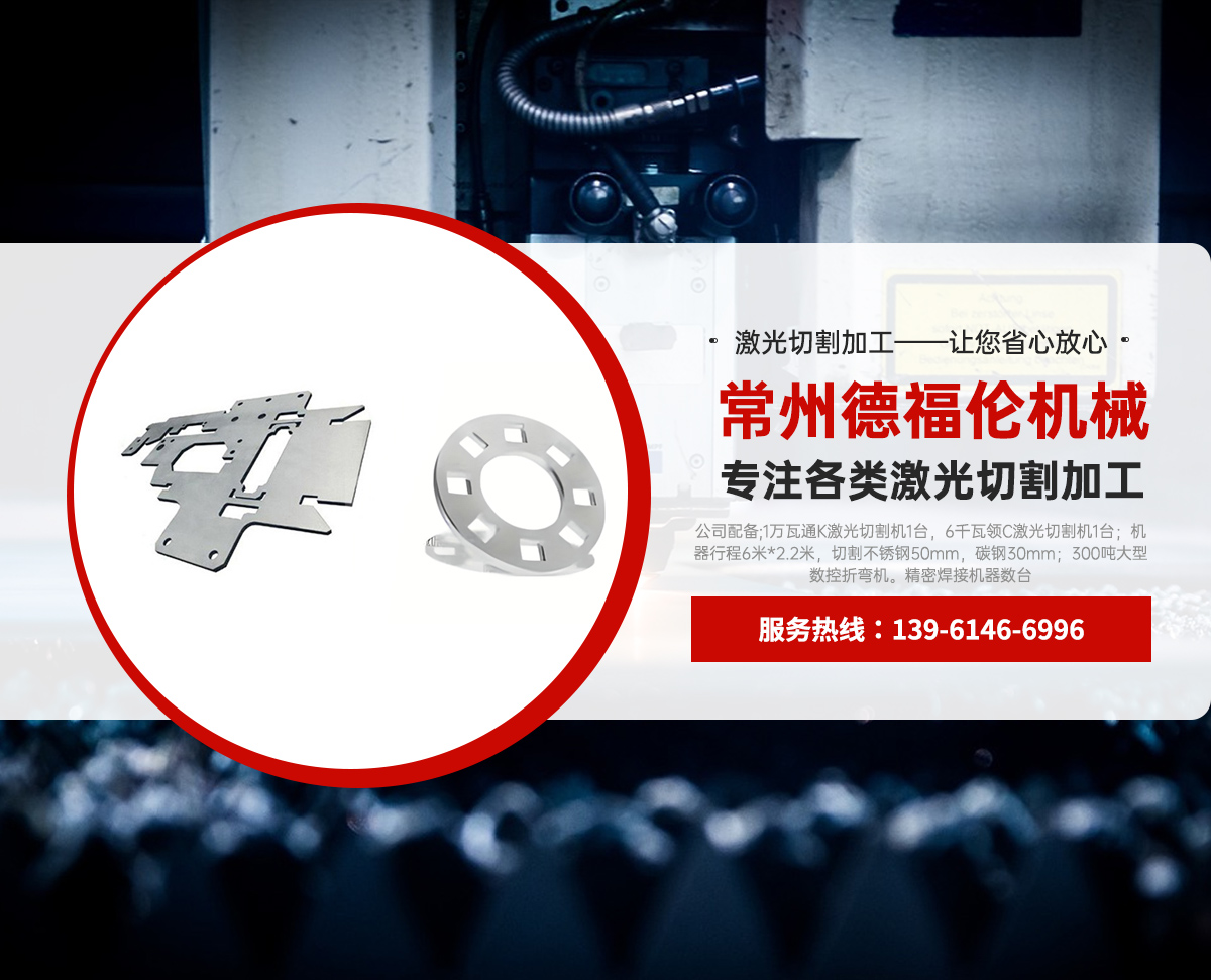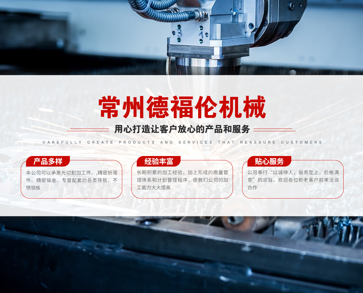 常州德福倫機械有限公司成立于2014年12月19號,位于江蘇省常州市武進區(qū)遙觀鎮(zhèn)建農(nóng)村劍童路56號西門;公司配備;1萬瓦通K激光切割機1臺,6千瓦領(lǐng)C激光切割機1臺;機器行程6米*2.2米,切割不銹鋼50mm,碳鋼30mm;300噸大型數(shù)控折彎機。精密焊接機器數(shù)臺。本公司可以承激光切割加工件、,精密折彎件、精密鈑金、專營配套的各類鐵板,不銹鋼板。長期積累的加工經(jīng)驗,加上形成的質(zhì)量管理體系和計劃管理程序,使我們公司的加工能力大大提高,滿足客戶所需,是我們公司的目標!公司奉行“以誠待人,服務(wù)為上,價格滿意”的宗旨。歡迎各位領(lǐng)導(dǎo);老總前來洽談合作!